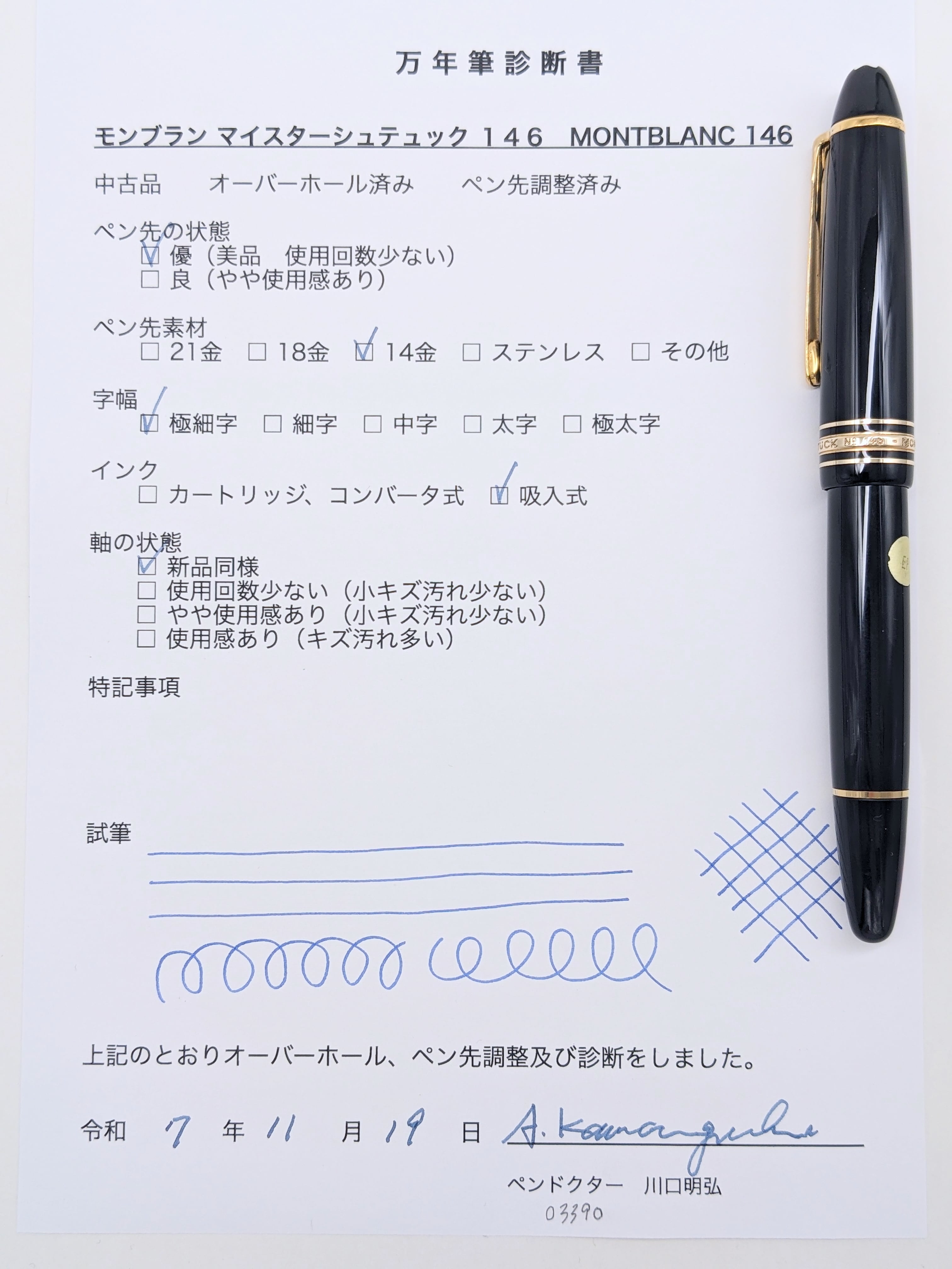 中古品 オーバーホール済み ペン先調整済み 字幅:ペン先表記「EF」 極細字 インク:吸入式 軸の使用感:新品同様 付属品:万年筆診断書 ========== 1970年代製造 ペン先14金(ペン先表記「14C」) ペン芯エボナイト 段差あり 吸入良好
