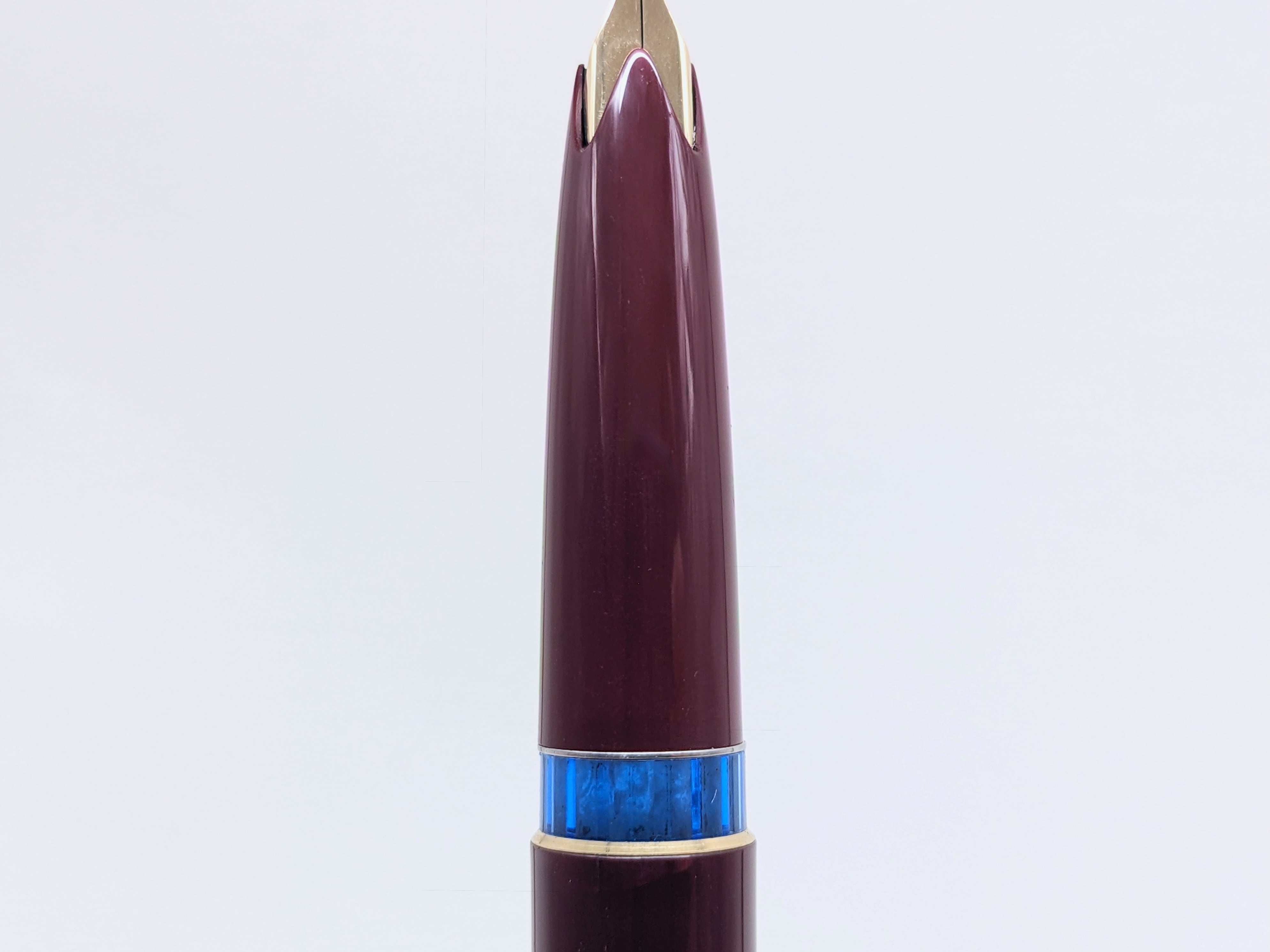 中古品 オーバーホール済み ペン先調整済み 字幅:極細字 *細字寄りの極細字です。 インク:吸入式 軸の使用感:使用回数少ない 付属品:万年筆診断書 ========== 1960年代製造 生産終了品 「No」表記あり ペン先14金 吸入良好 軸色:ボルドー