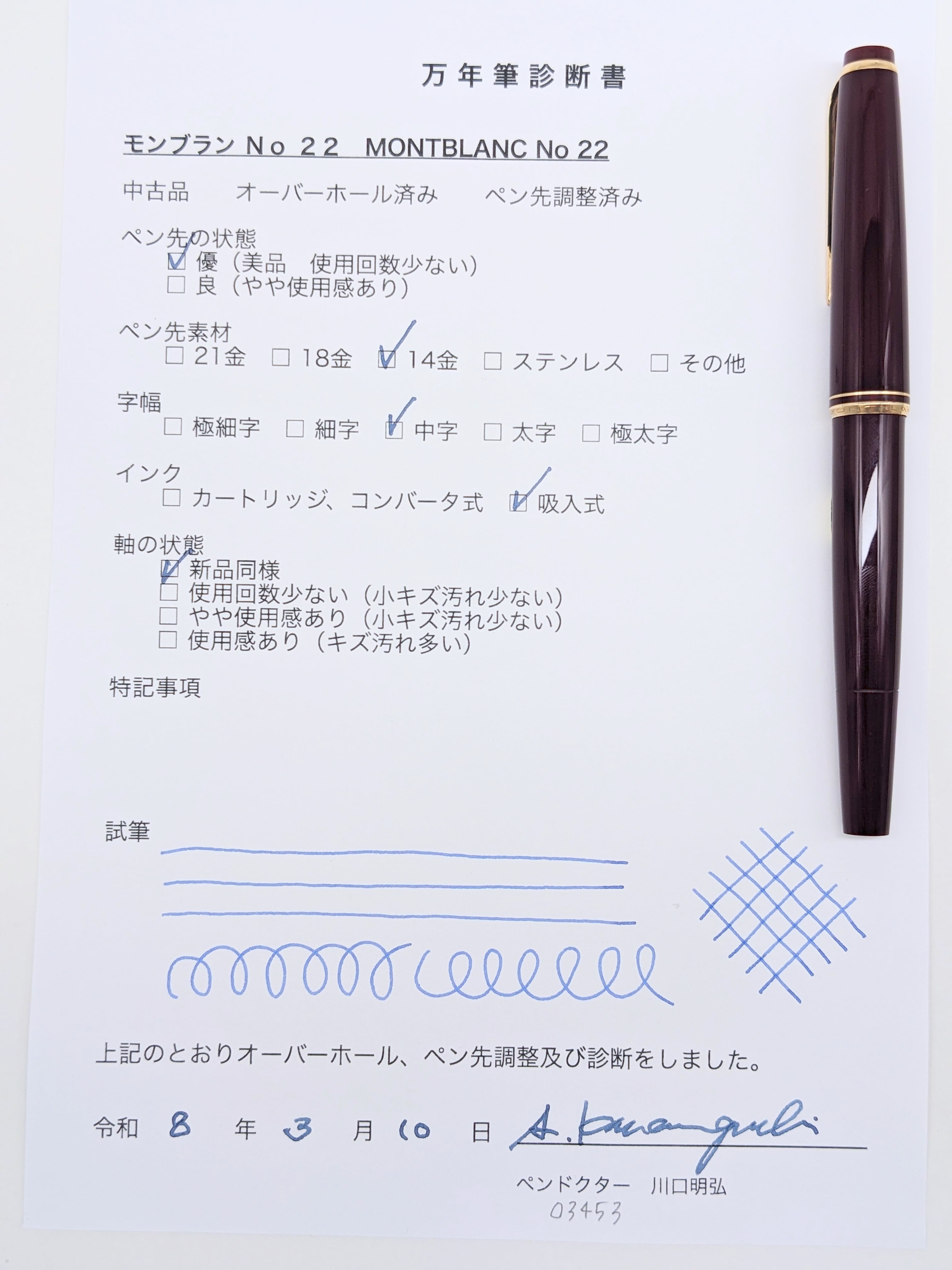 中古品 オーバーホール済み ペン先調整済み 字幅:ペン先表記「M」 中字 インク:吸入式 軸の使用感:新品同様 付属品:万年筆診断書 ========== 1960年代製造 生産終了品 「No」表記あり ペン先14金 吸入良好 軸色:ボルドー
