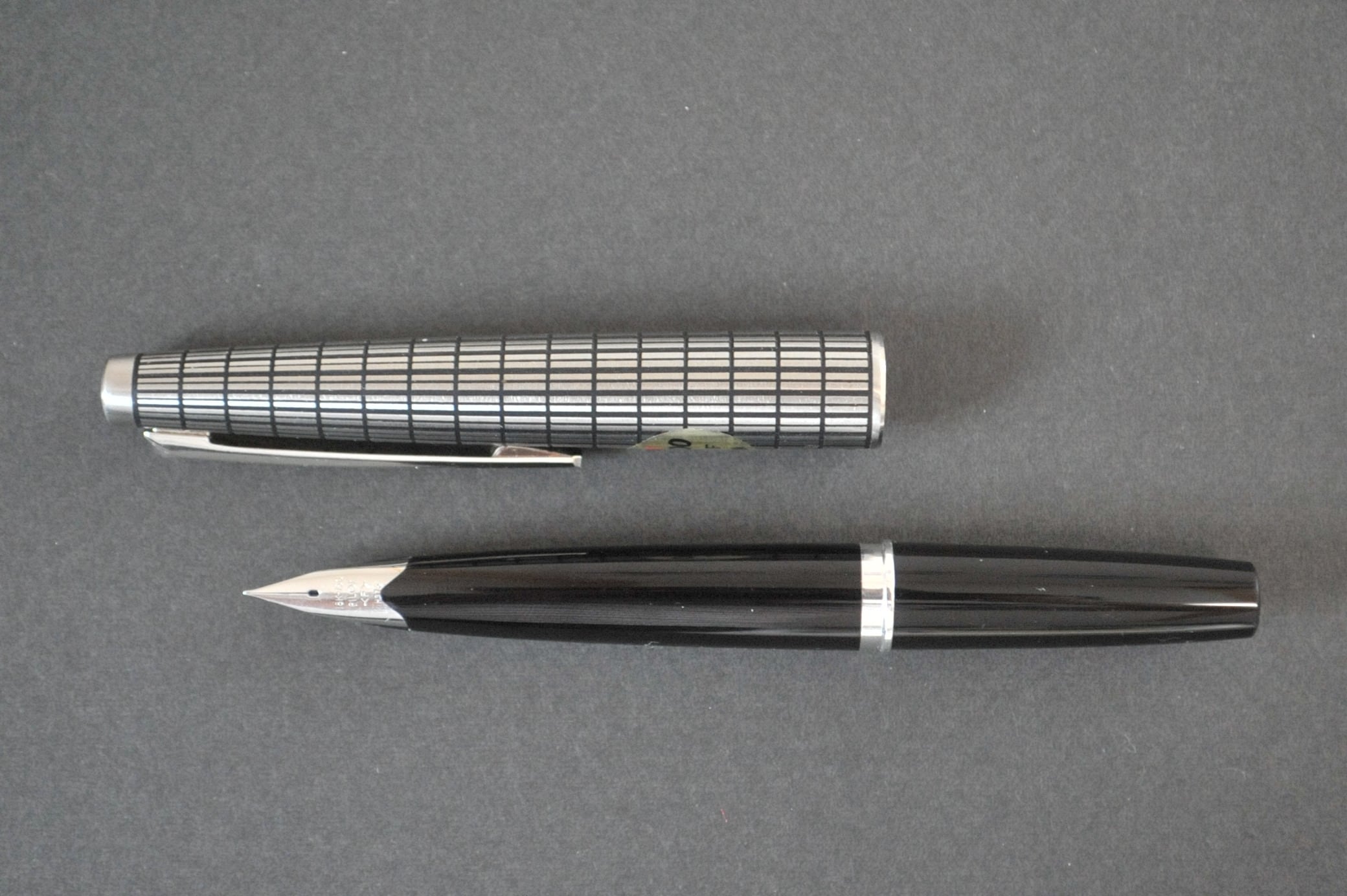 中古品(未使用品) オーバーホール済み ペン先調整済み 字幅:ペン先表記「F」 細字 インク:カートリッジ式 軸の使用感:新品同様 付属品:カートリッジ1本(ブルーブラック) 万年筆診断書 ========== 1976年3月製造 「H376」表記 生産終了品 ペン先18金 〄