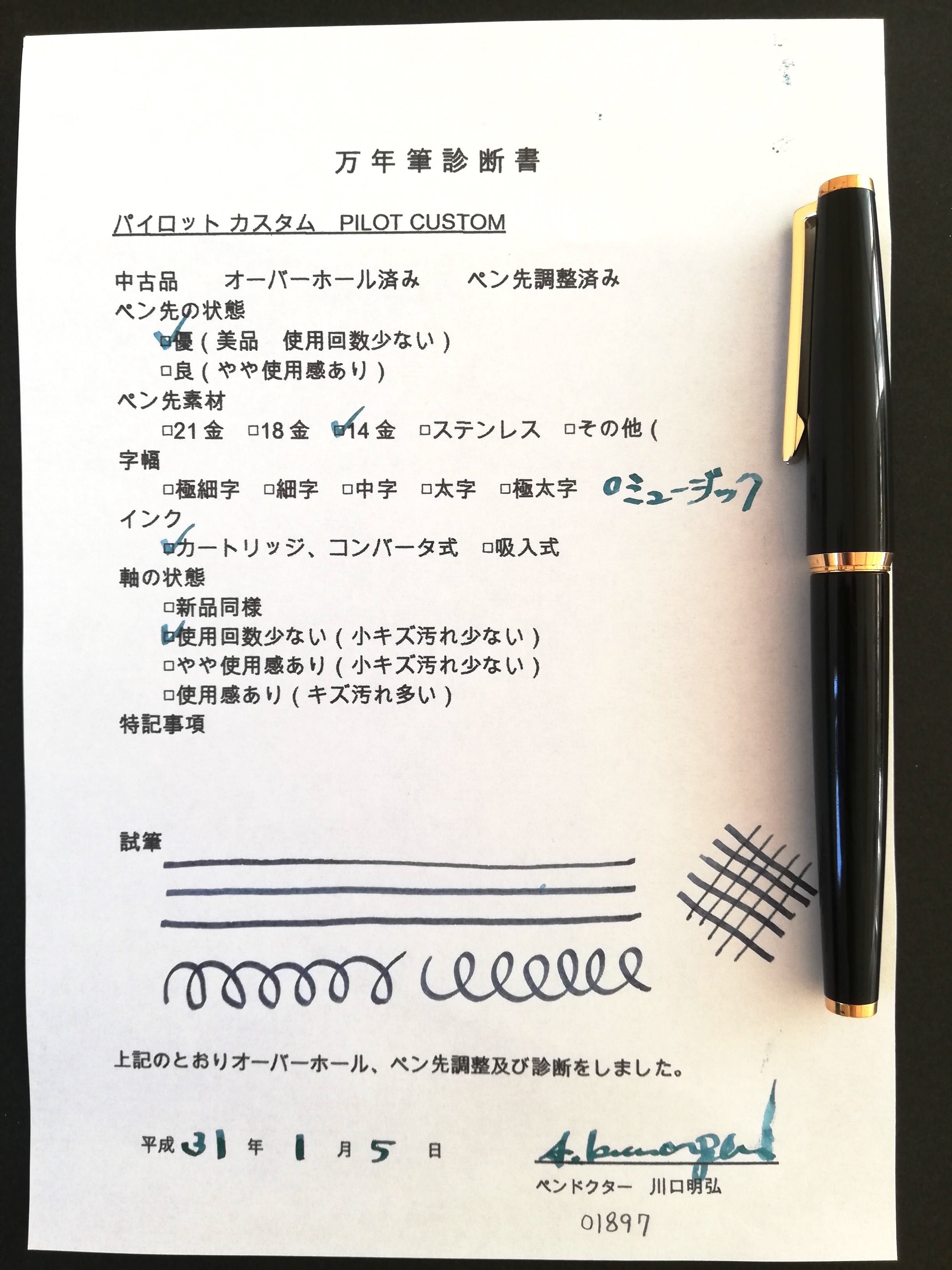 中古品 オーバーホール済み ペン先調整済み 字幅:ペン先表記「MUSIC」 ミュージック インク:カートリッジ式 コンバータ式 軸の使用感:使用回数少ない 付属品:カートリッジ1本(ブルーブラック) 万年筆診断書 ========== 1980年代製造 生産終了品 ペン先14金