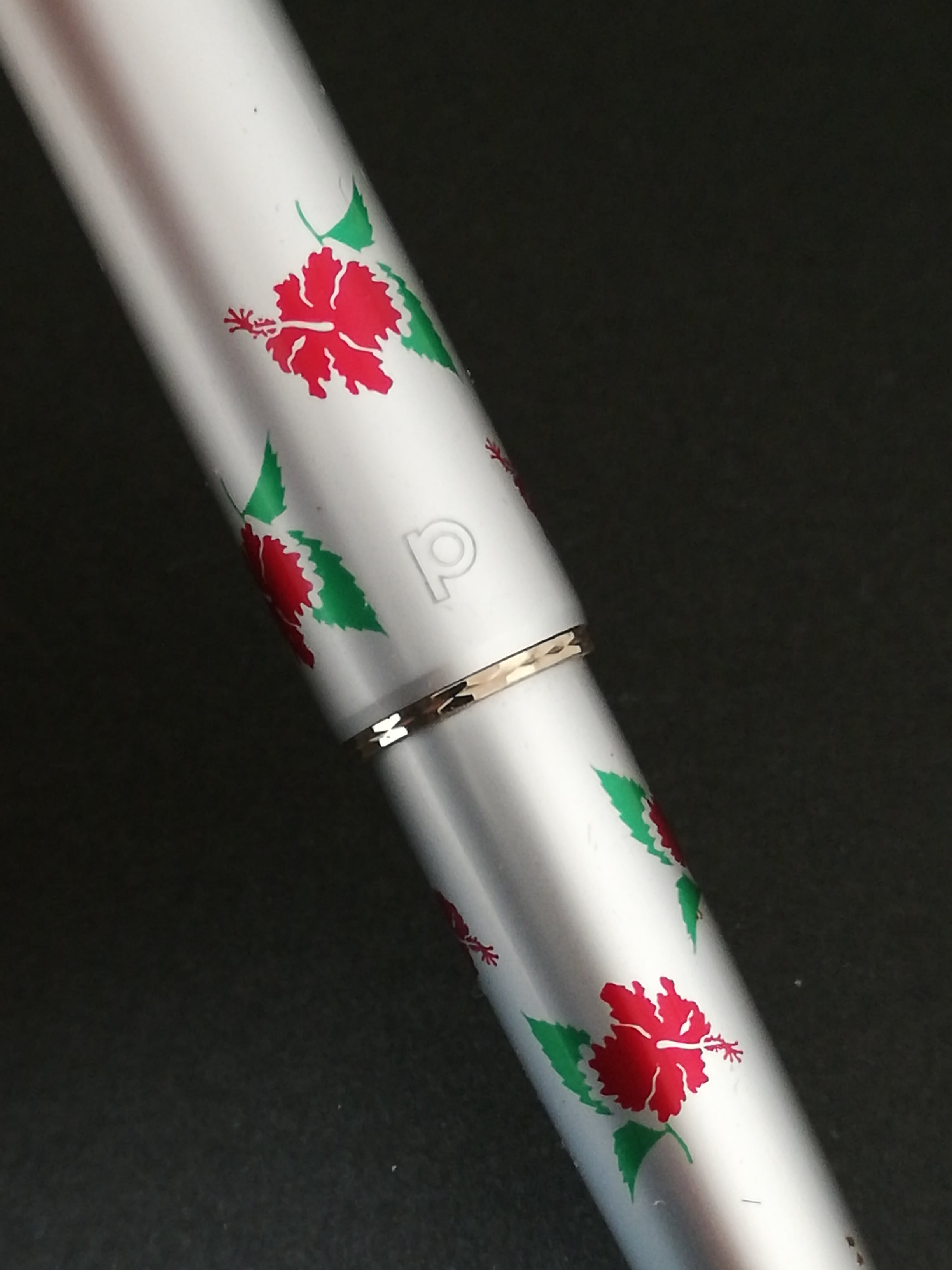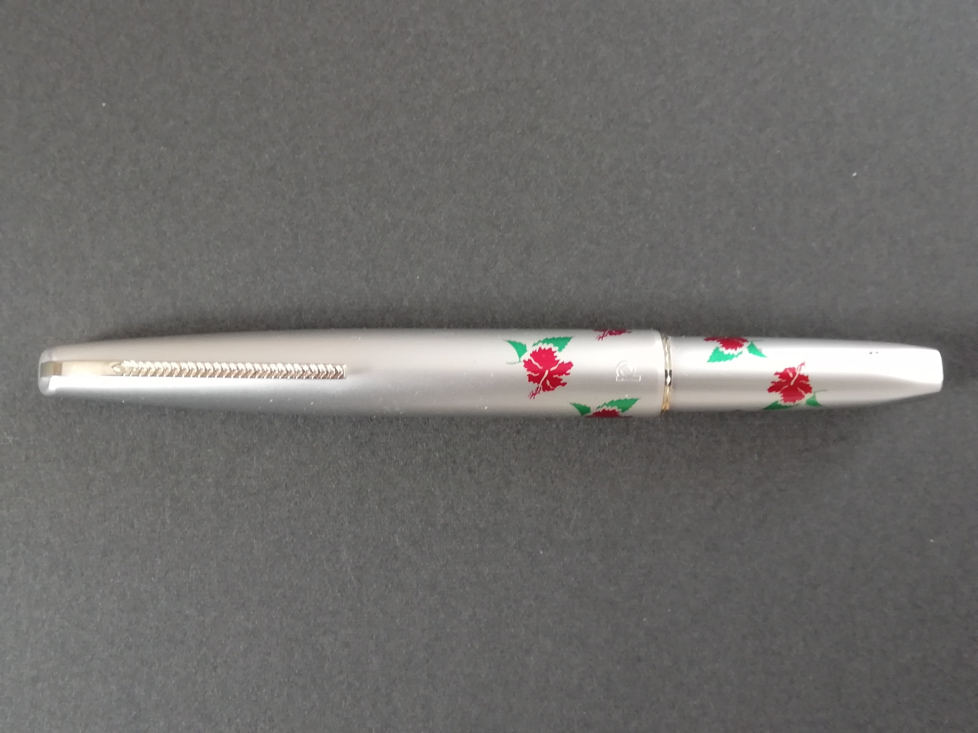 中古品 オーバーホール済み ペン先調整済み 字幅:ペン先表記「細字」 インク:カートリッジ式 軸の使用感:新品同様 付属品:カートリッジ1本(ブルーブラック) 万年筆診断書 ========== 1970年代製造 生産終了品 軸:ハイビスカス柄 ペン先14金