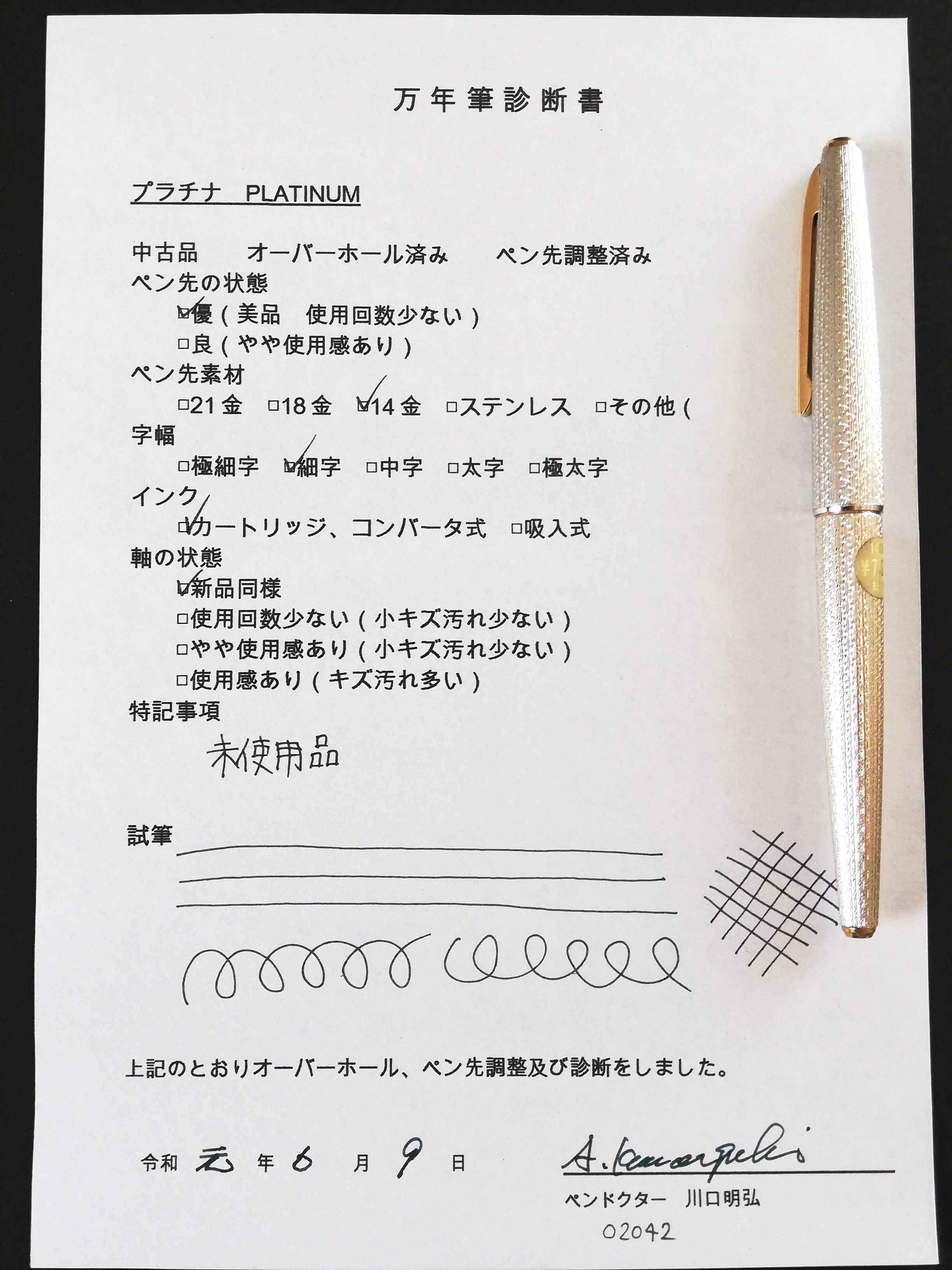 中古品(未使用品) オーバーホール済み ペン先調整済み 字幅:ペン先表記「細字」 インク:カートリッジ式 コンバータ式 軸の使用感:新品同様 付属品:カートリッジ1本(ブルーブラック) 万年筆診断書 ========== 1970年代製造 生産終了品 ペン先14金ホワイトゴールド