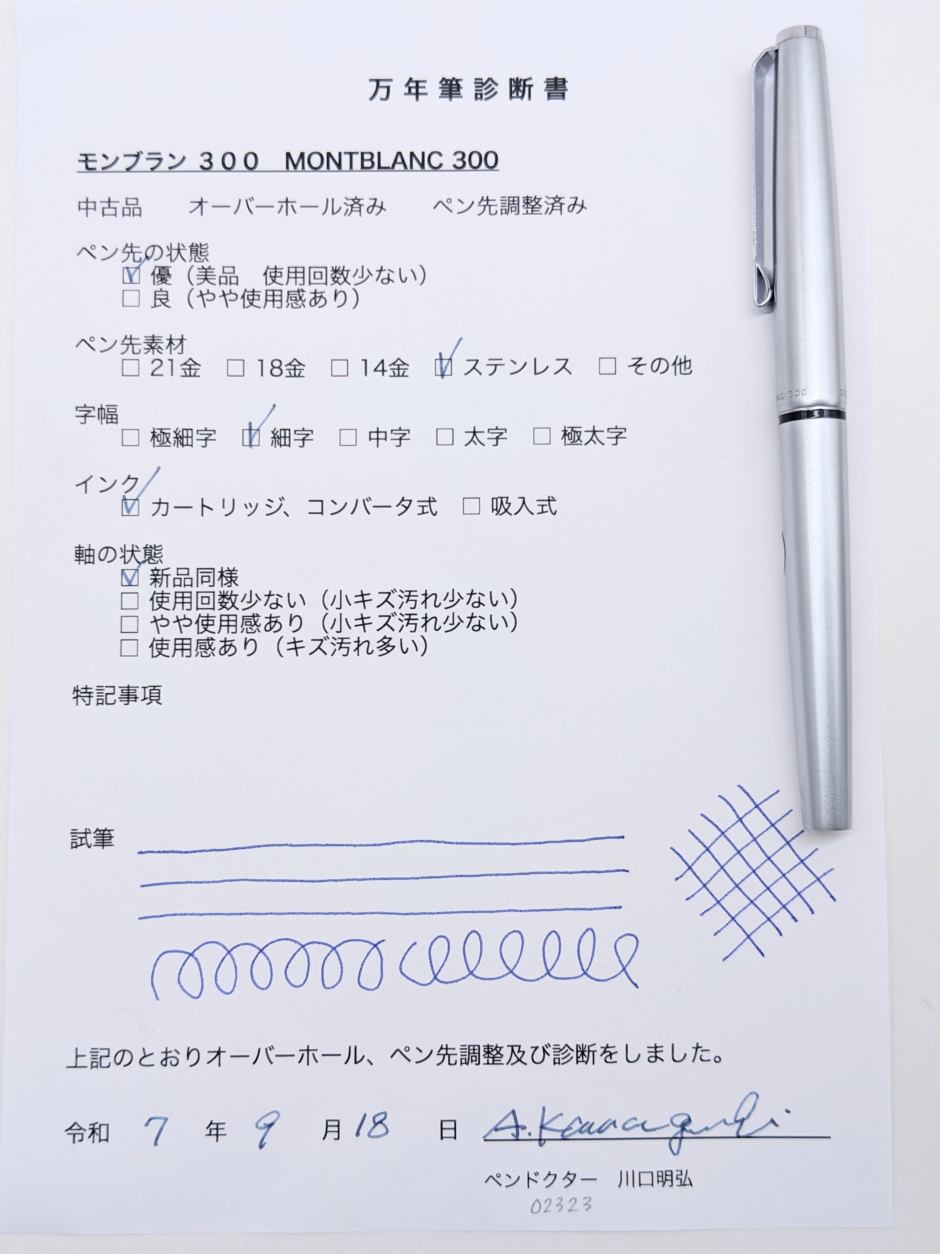 中古品 オーバーホール済み ペン先調整済み 字幅:ペン先表記「F」 細字 インク:カートリッジ式 コンバータ式 軸の使用感:新品同様 付属品:プラスチックケース 使用説明書 カートリッジ1本(ミッドナイトブルー) 万年筆診断書 ========== 1970年代製造 生産終了品 ペン先ステンレス