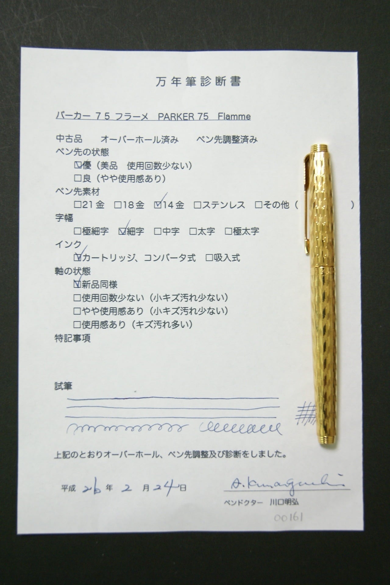 中古品 オーバーホール済み ペン先調整済み 字幅:ペン先表記F 細字 インク:コンバータ式 軸の使用感:新品同様 付属品:コンバータ1本(装着済み) 万年筆診断書 ========== 20μ金張り MADE IN FRANCE