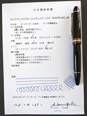 中古品 オーバーホール済み ペン先調整済み 字幅:ペン先表記「M」 中字 インク:吸入式 軸の使用感:新品同様 付属品:万年筆診断書 ========== 1980年代製造 ペン先14金(ペン先表記「14K」) ペン芯エボナイト 段差あり 吸入良好