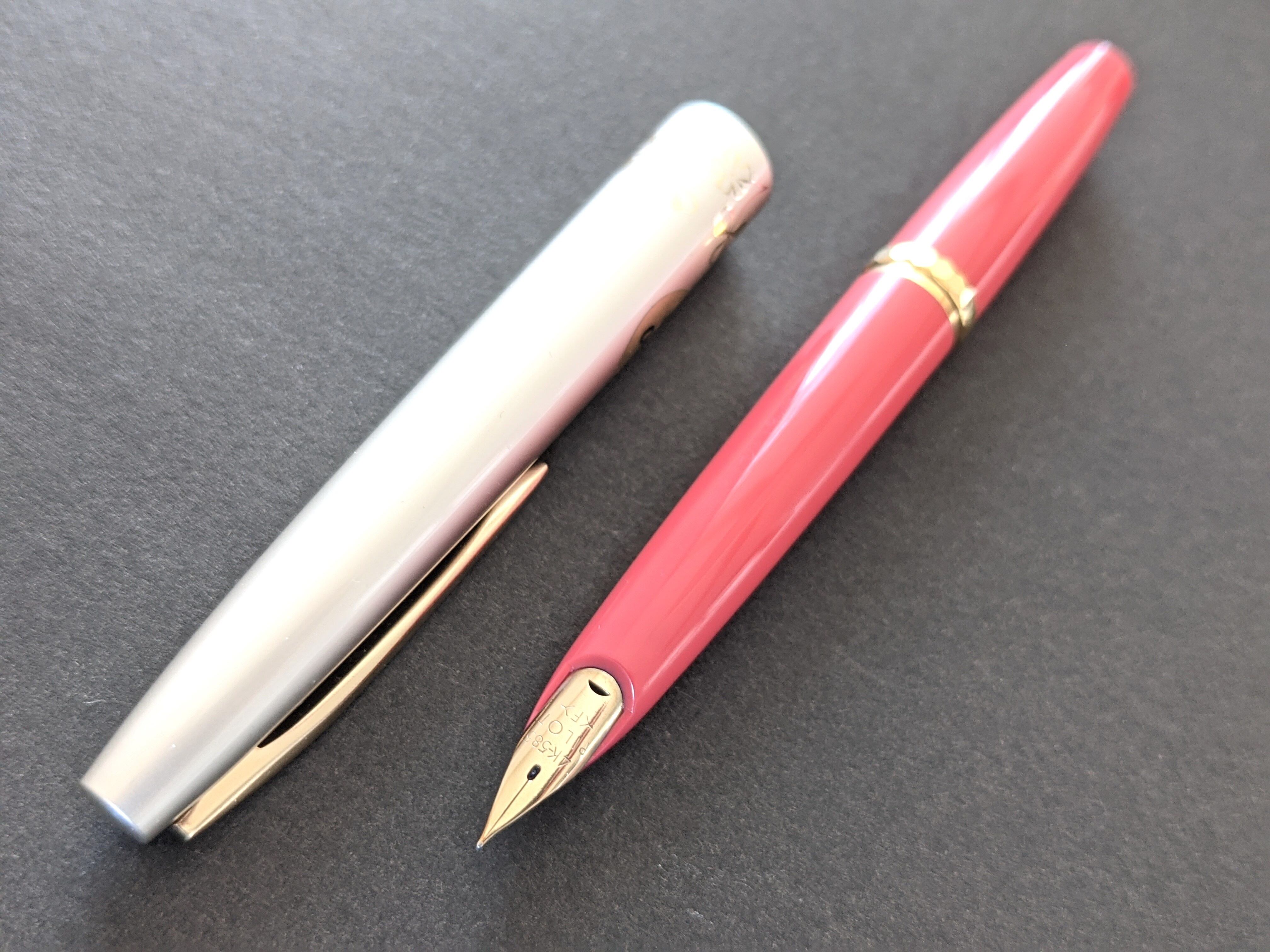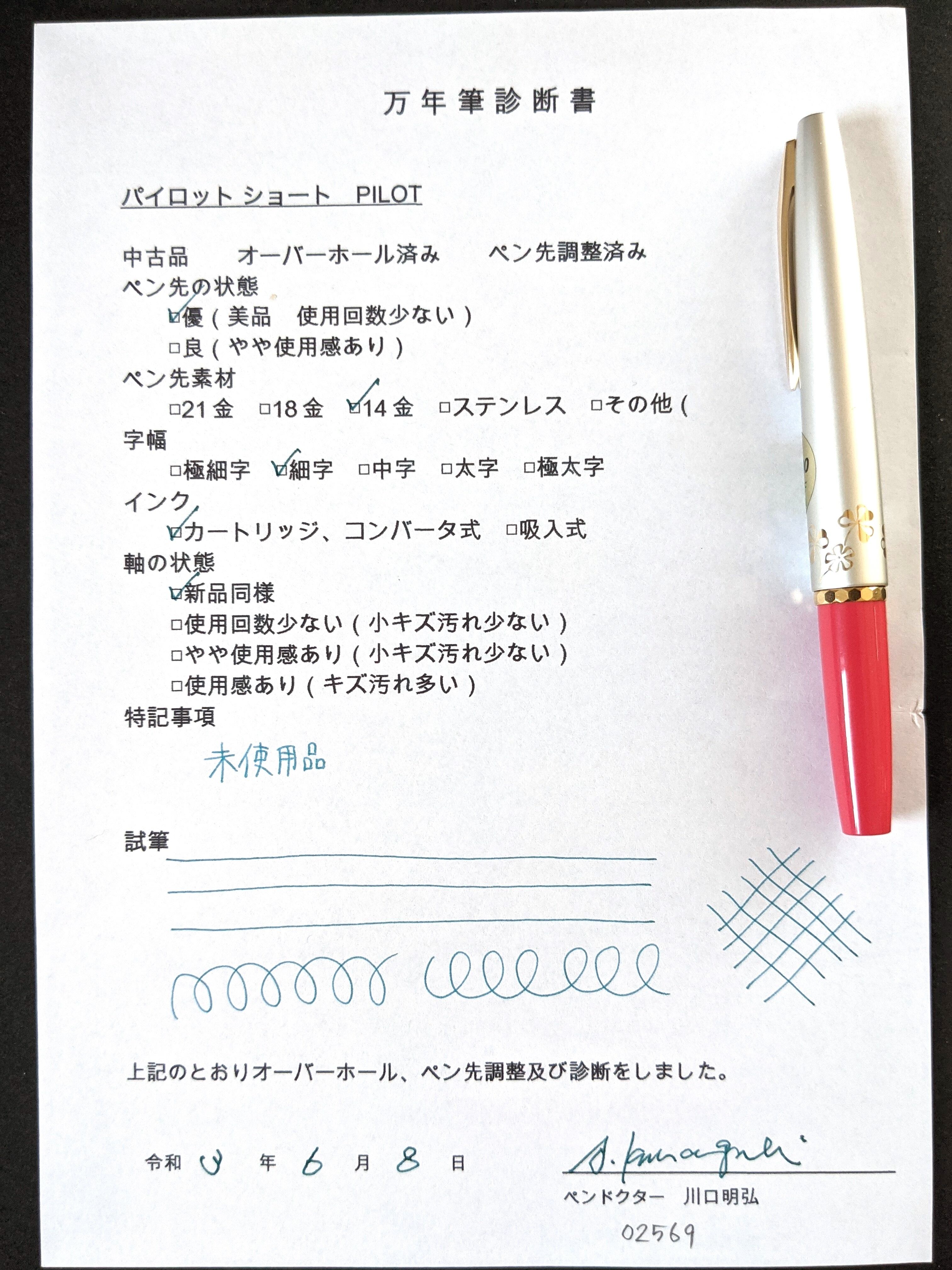 中古品(未使用品) オーバーホール済み ペン先調整済み 字幅:ペン先表記「細字 F」 インク:カートリッジ式 軸の使用感:新品同様 付属品:カートリッジ1本(ブルーブラック) 万年筆診断書 ========== 1960年代製造 生産終了品 ペン先14金 キャップ:アルミ製