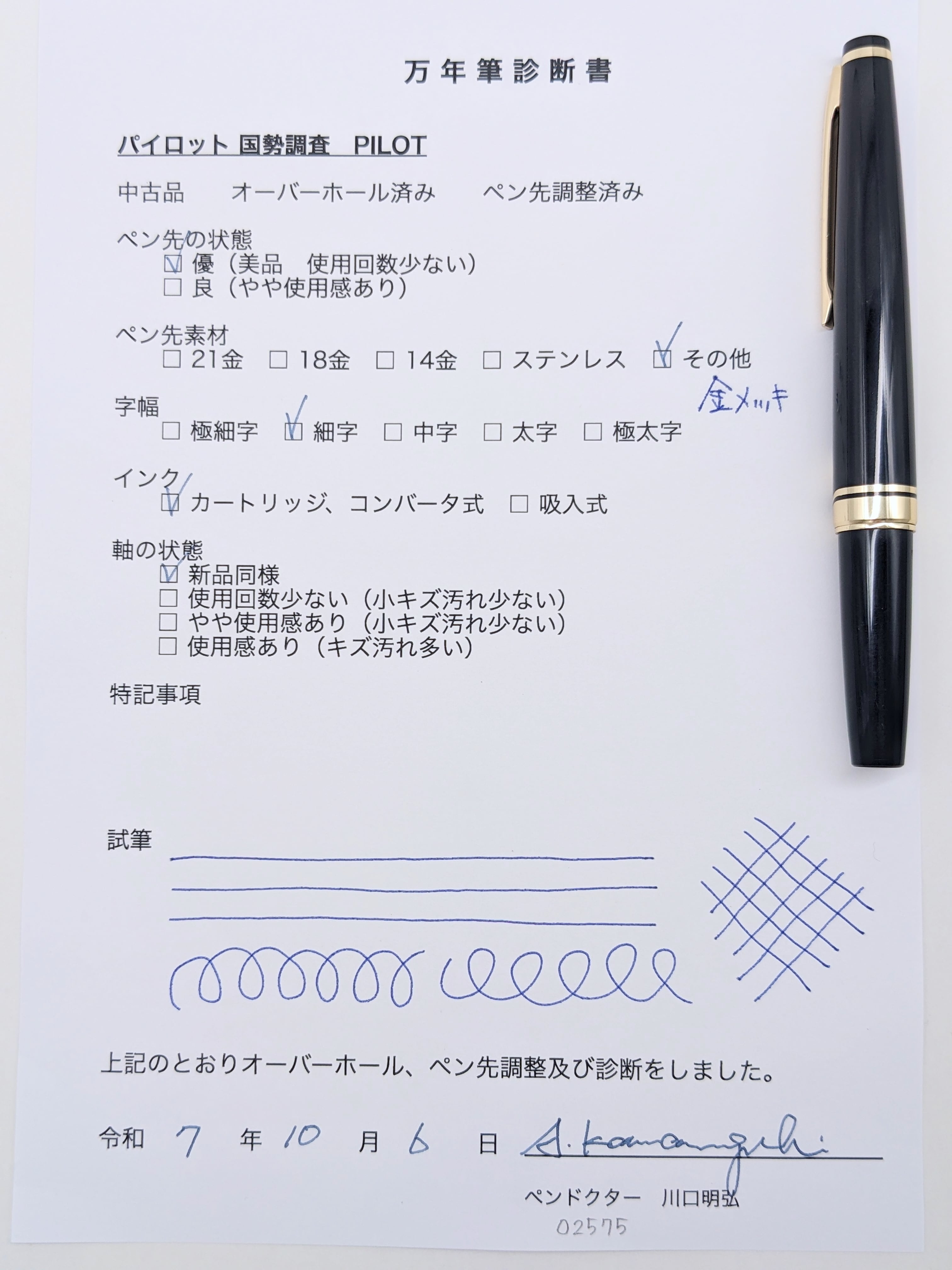 中古品 オーバーホール済み ペン先調整済み 字幅:細字 インク:カートリッジ式 軸の使用感:新品同様 付属品:カートリッジ1本(ブルーブラック) 万年筆診断書 ========== 1970年代製造 生産終了品 国勢調査配布品 ペン先メッキ