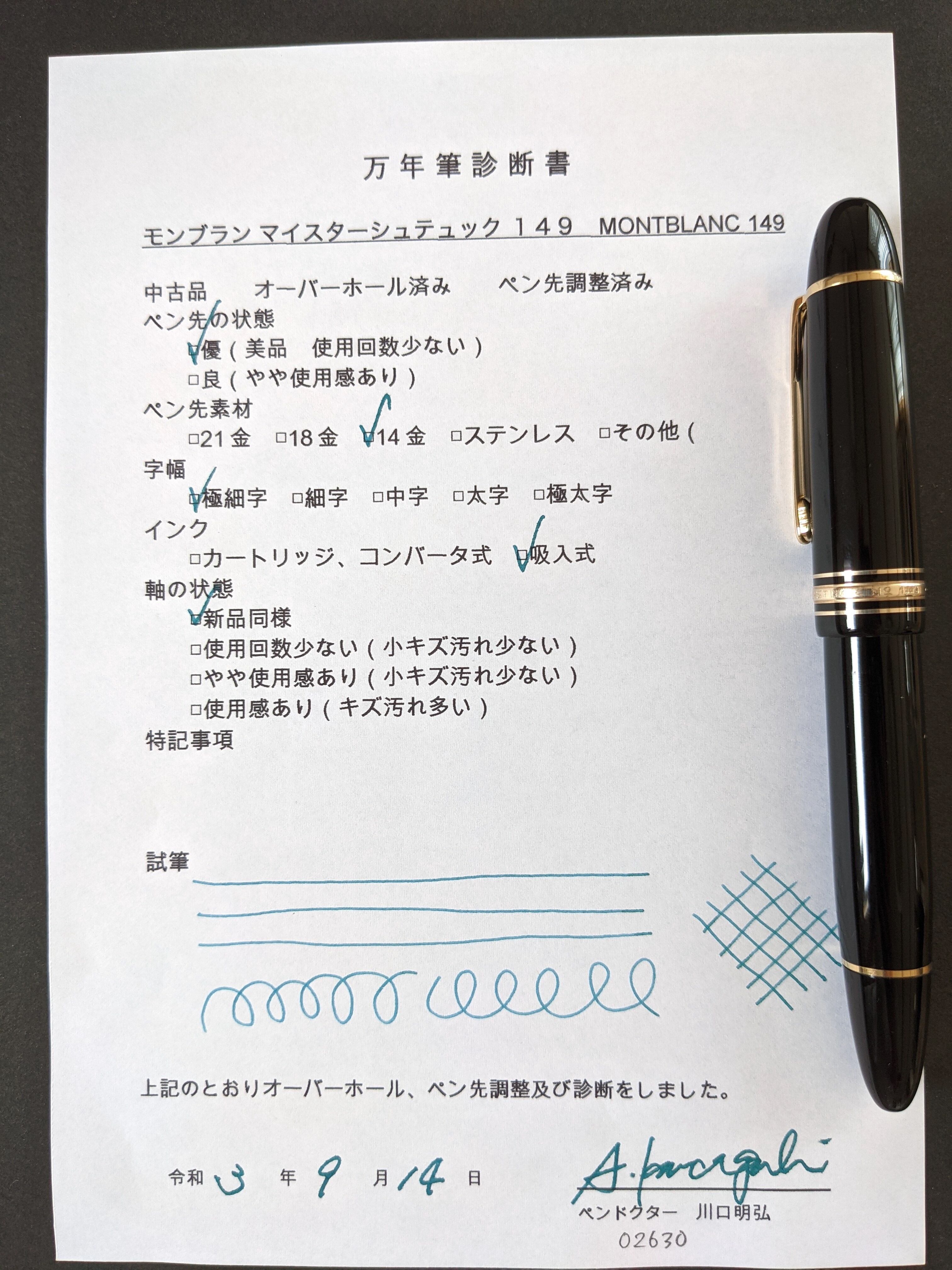 中古品 オーバーホール済み ペン先調整済み 字幅:極細字 インク:吸入式 軸の使用感:新品同様 付属品:万年筆診断書 ========== 1980年代製造 ペン先14金(ペン先表記「14K」) ペン芯エボナイト 溝なし、段差あり 吸入良好