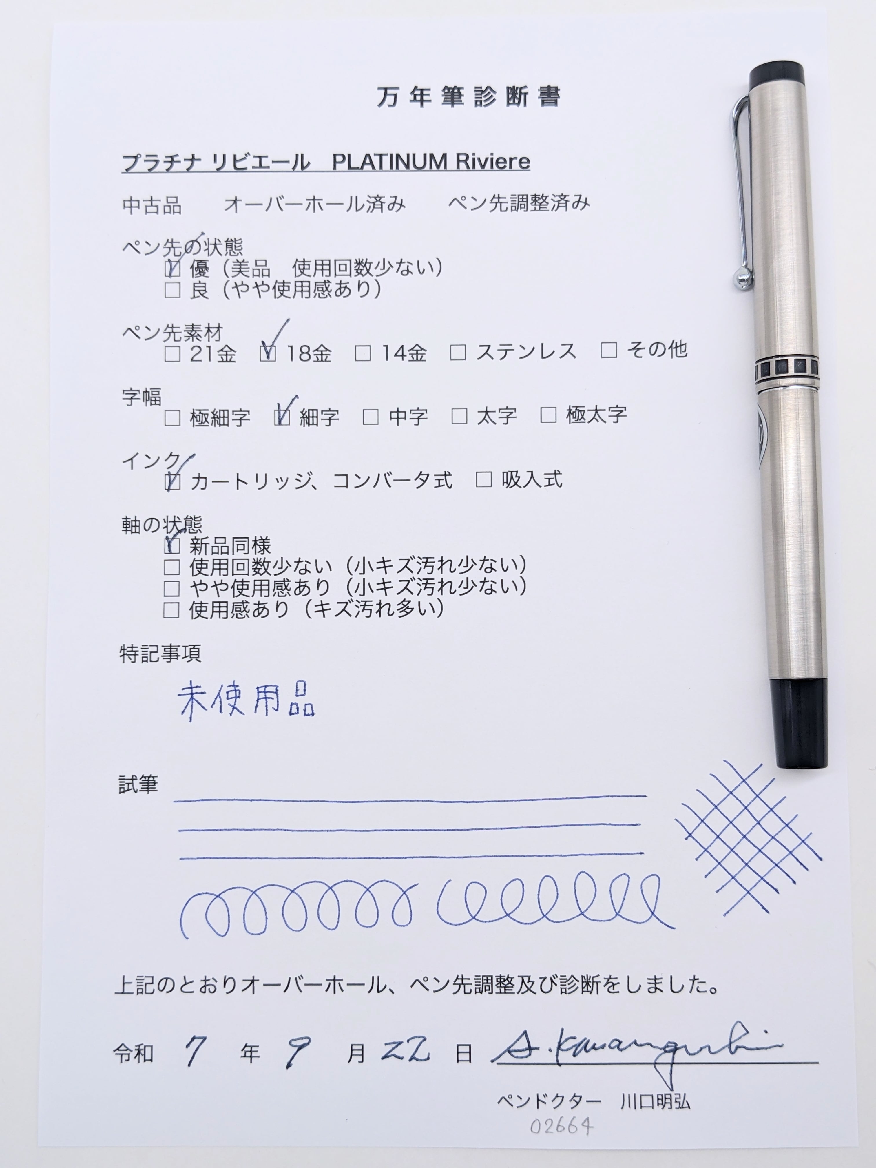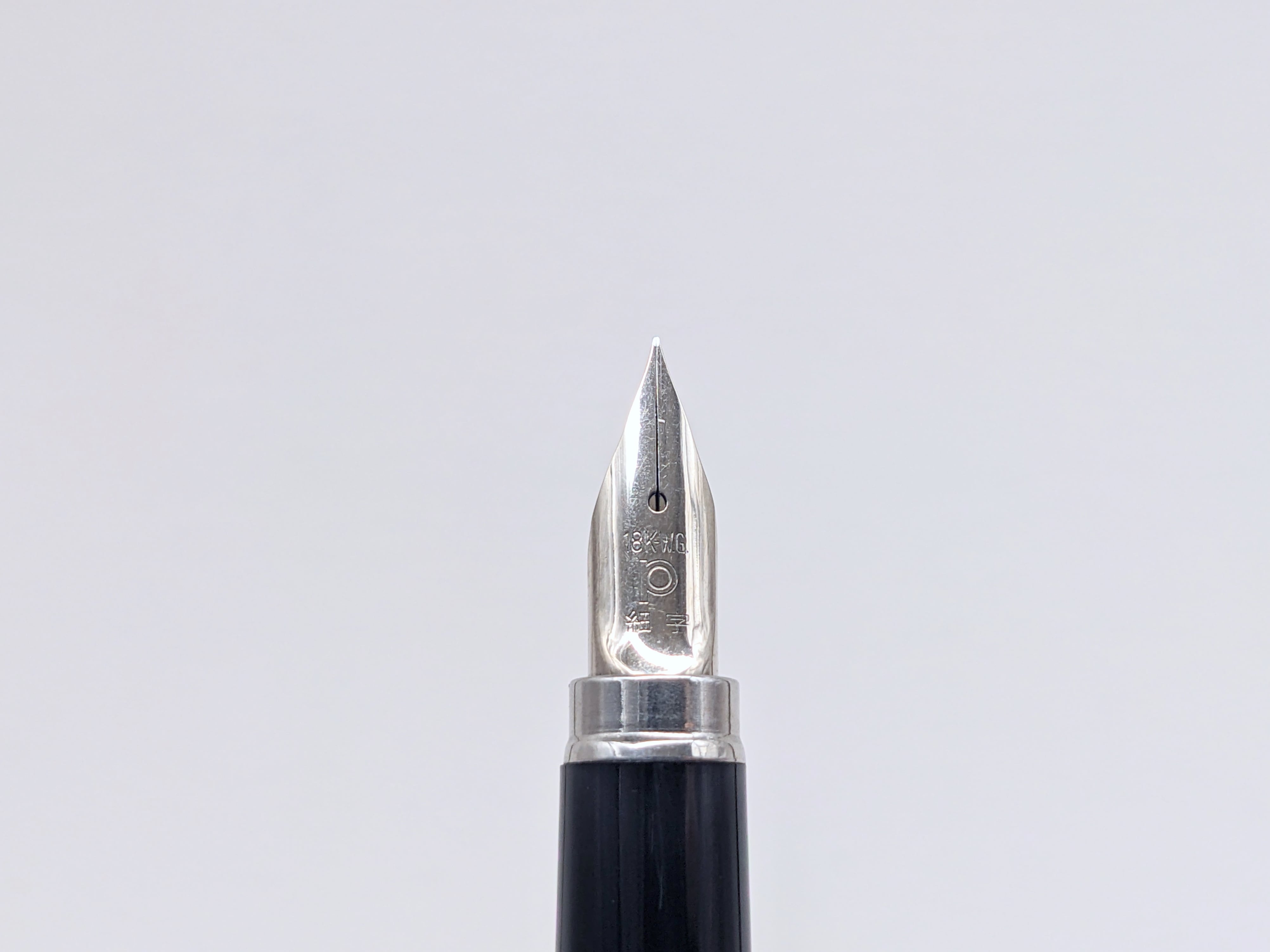 中古品(未使用品) オーバーホール済み ペン先調整済み 字幅:ペン先表記「細字」 インク:カートリッジ式 コンバータ式 軸の使用感:新品同様 付属品:カートリッジ1本(ブルーブラック) 万年筆診断書 ========== 1970年代製造 生産終了品 当時定価:7,000円 ペン先18金ホワイトゴールド(ペン先表記「18K-WG」)