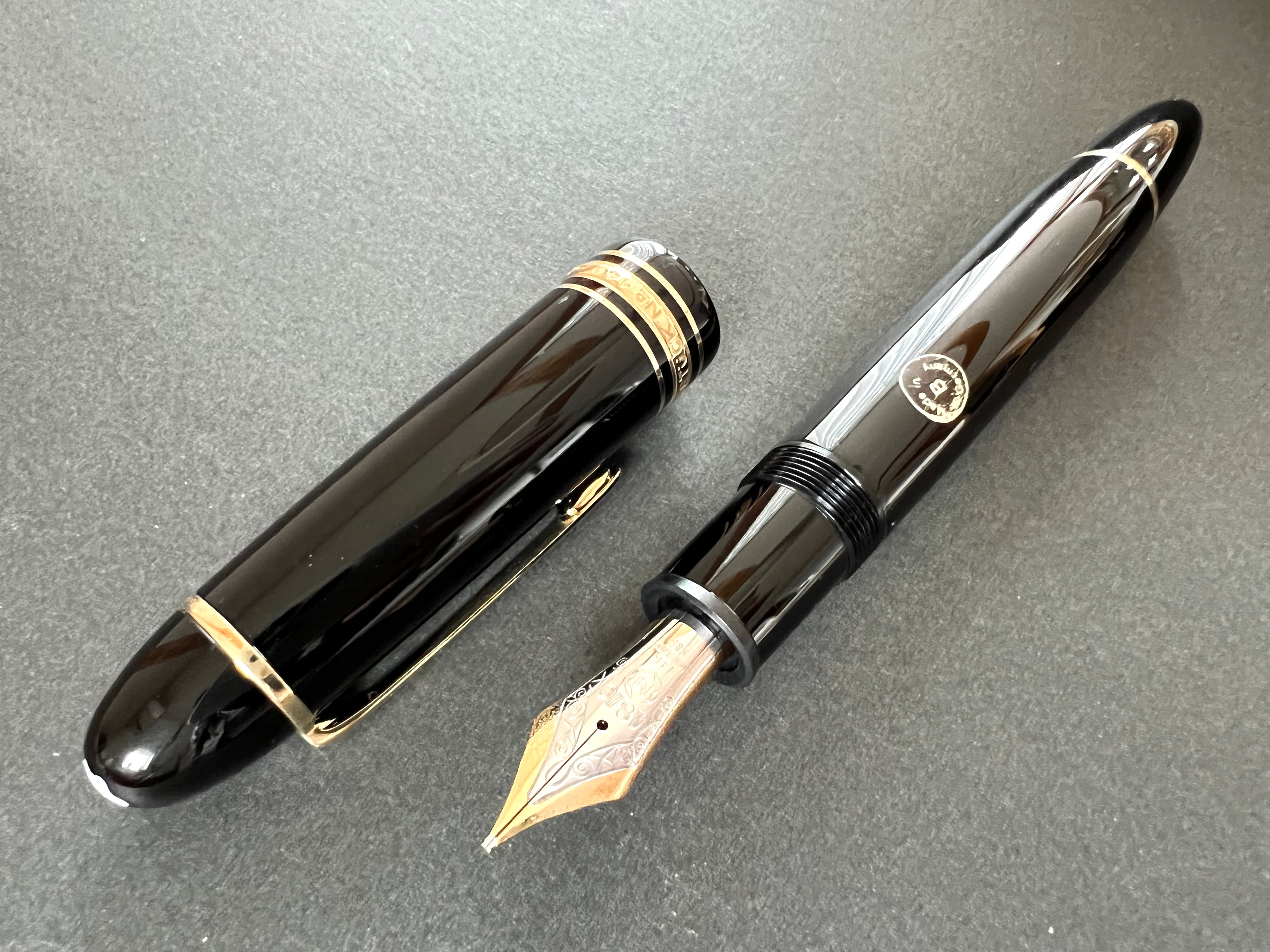 中古品 オーバーホール済み ペン先調整済み 字幅:ペン先表記「B」 太字 インク:吸入式 軸の使用感:新品同様 付属品:ケース オリジナル説明書 万年筆診断書 ========== 1980年代製造 ペン先14金(ペン先表記「14K」) ペン芯エボナイト 溝なし、段差あり 吸入良好