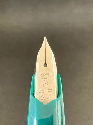 中古品(未使用品) オーバーホール済み ペン先調整済み 字幅:ペン先表記「細字」 インク:カートリッジ式 コンバータ式 軸の使用感:新品同様 付属品:カートリッジ1本(ブルーブラック) 万年筆診断書 ========== 1970年代製造 生産終了品 当時定価:5,000円 ペン先18金ホワイトゴールド(ペン先表記「18K-WG」) 首軸色:緑