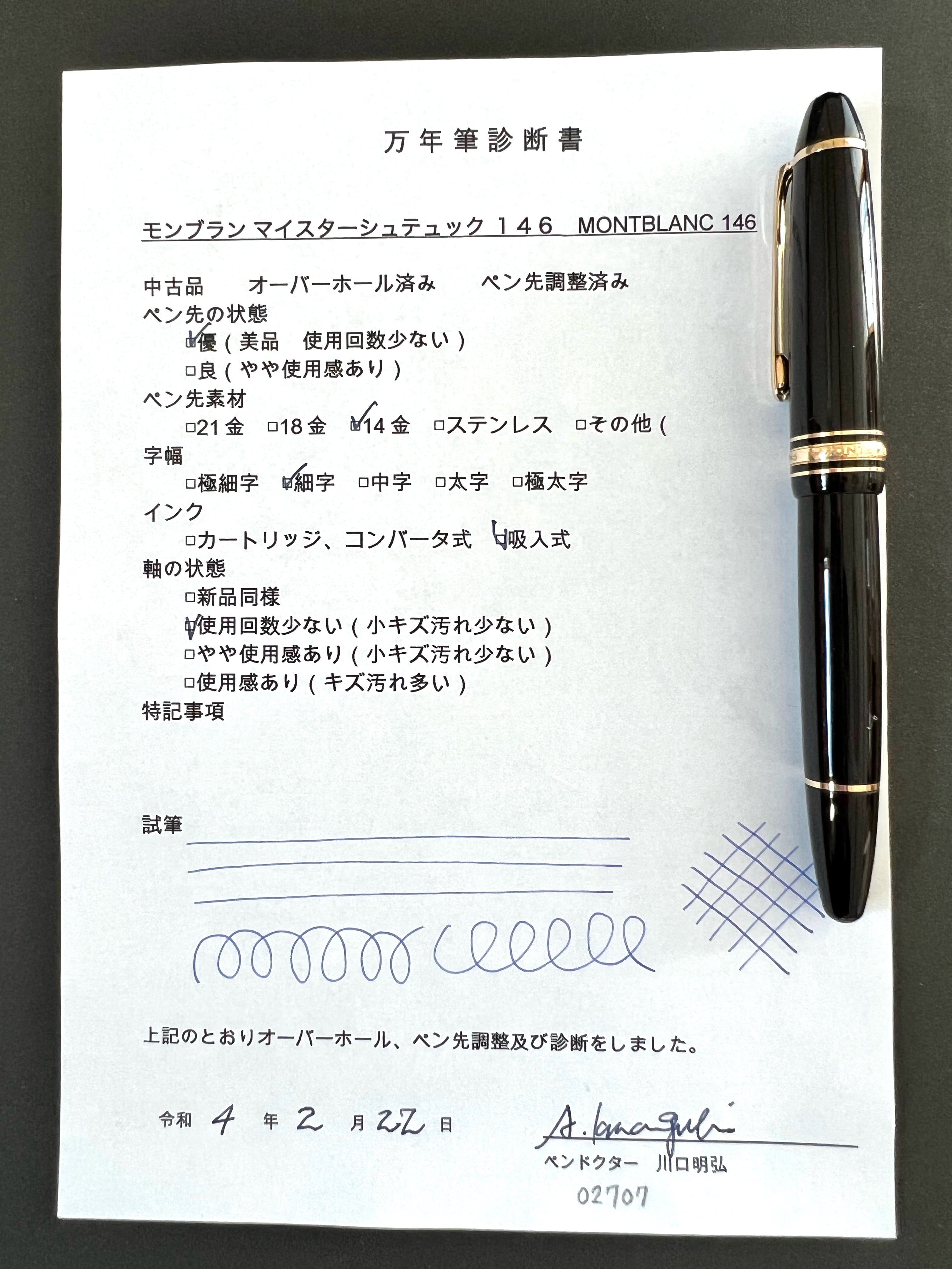 中古品 オーバーホール済み ペン先調整済み 字幅:細字 インク:吸入式 軸の使用感:使用回数少ない 付属品:万年筆診断書 ========== 1980年代製造 ペン先14金(ペン先表記「14K」) ペン芯エボナイト 段差あり 吸入良好