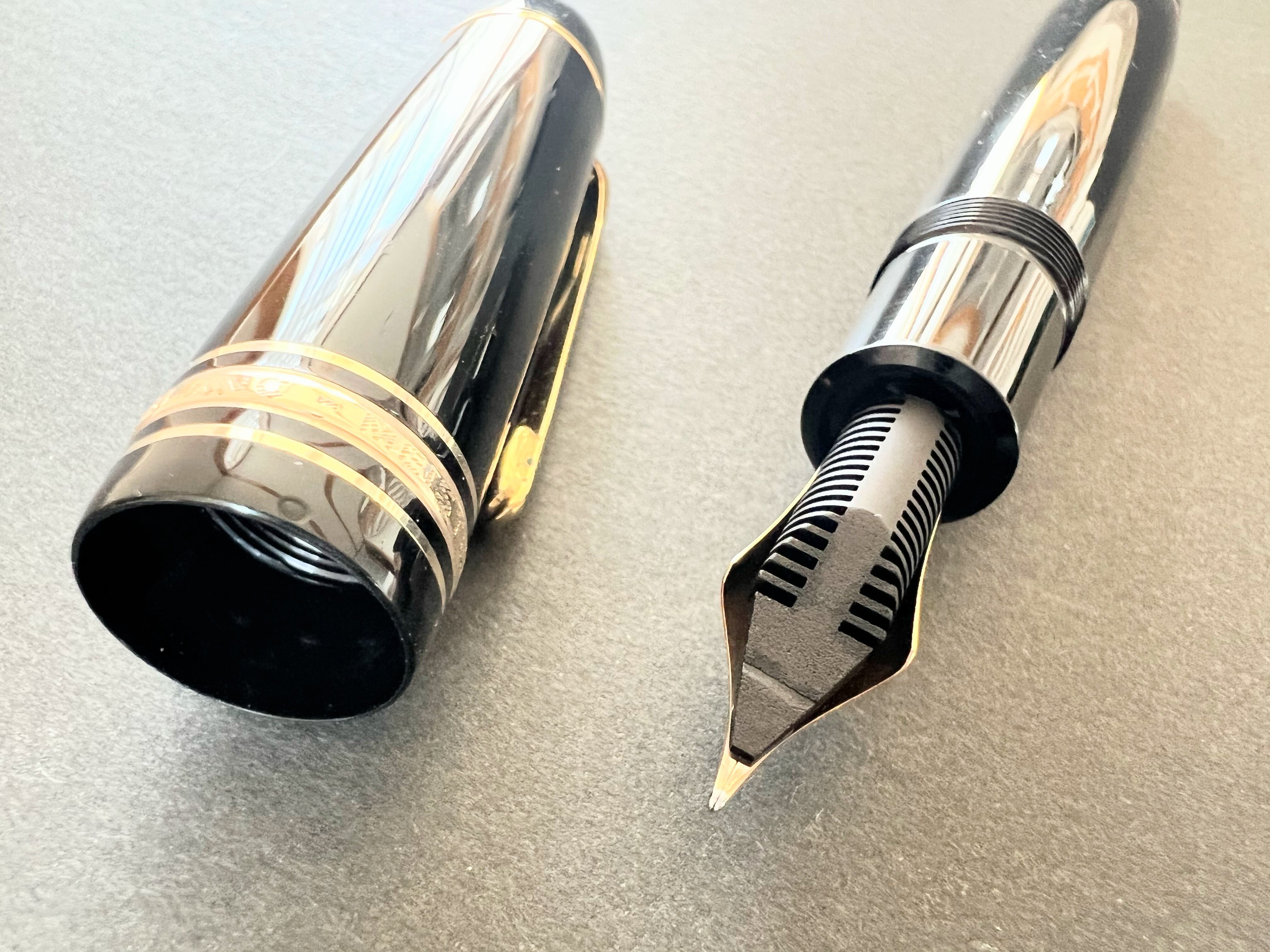 中古品 オーバーホール済み ペン先調整済み 字幅:中字 インク:吸入式 軸の使用感:使用回数少ない 付属品:万年筆診断書 ========== 1970年代製造 ペン先14金(ペン先表記「14C」) ペン芯エボナイト 溝、段差あり 吸入良好