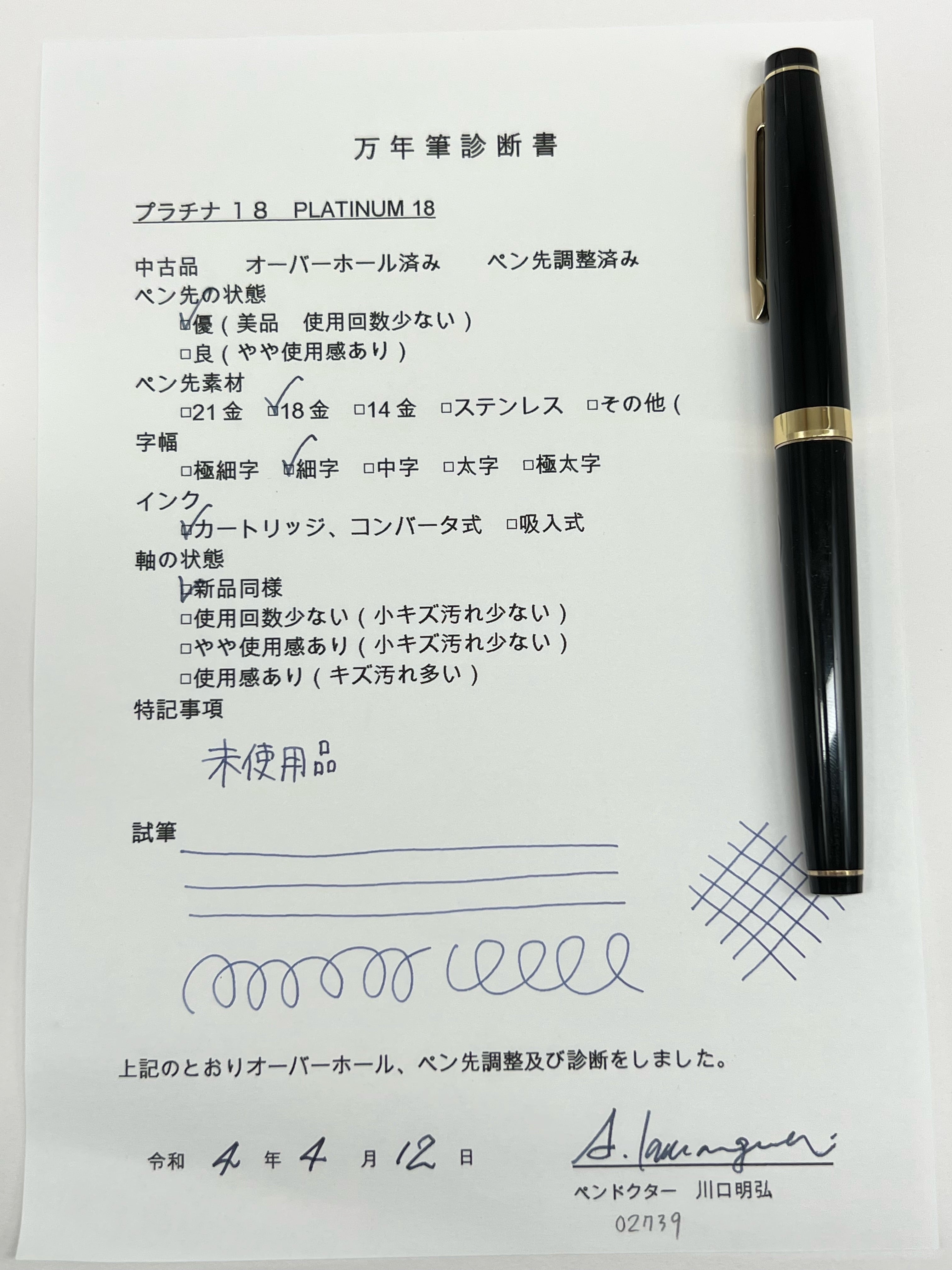 中古品(未使用品) オーバーホール済み ペン先調整済み 字幅:ペン先表記「細字」 インク:カートリッジ式 コンバータ式 軸の使用感:新品同様 付属品:カートリッジ1本(ブルーブラック) 万年筆診断書 ========== 1960年代製造 生産終了品 当時定価:5,000円 ペン先18金(ペン先表記「18K」)