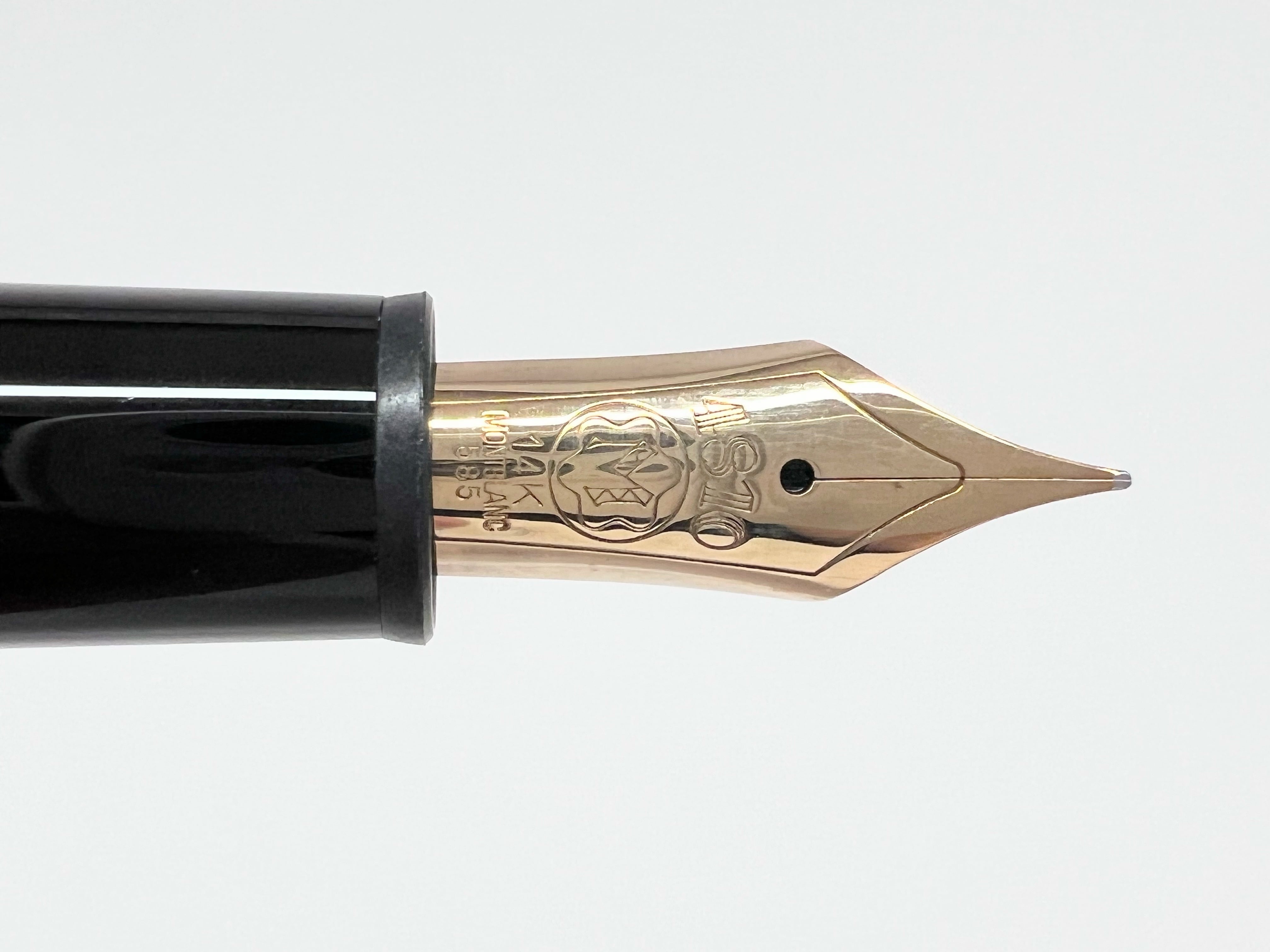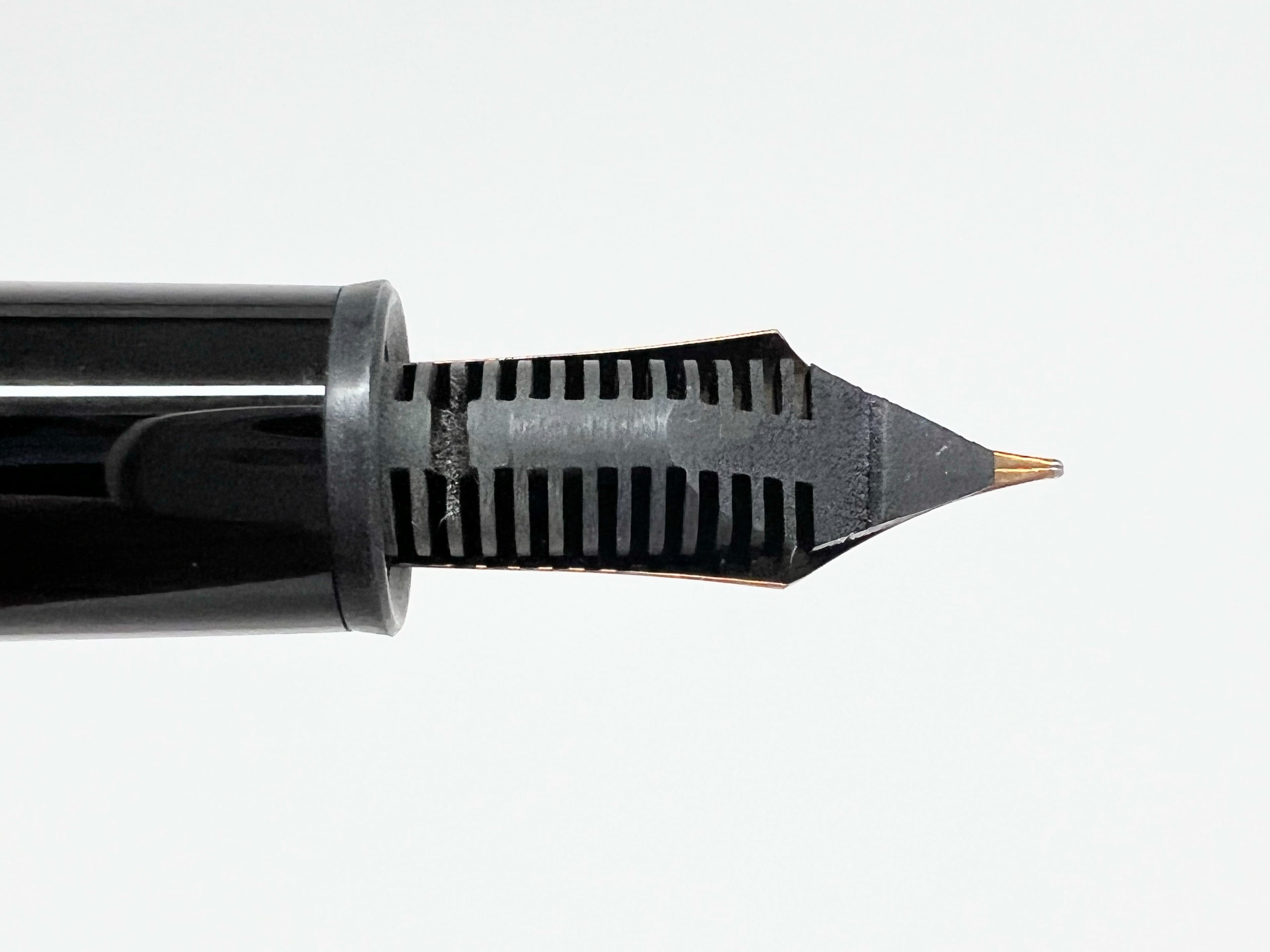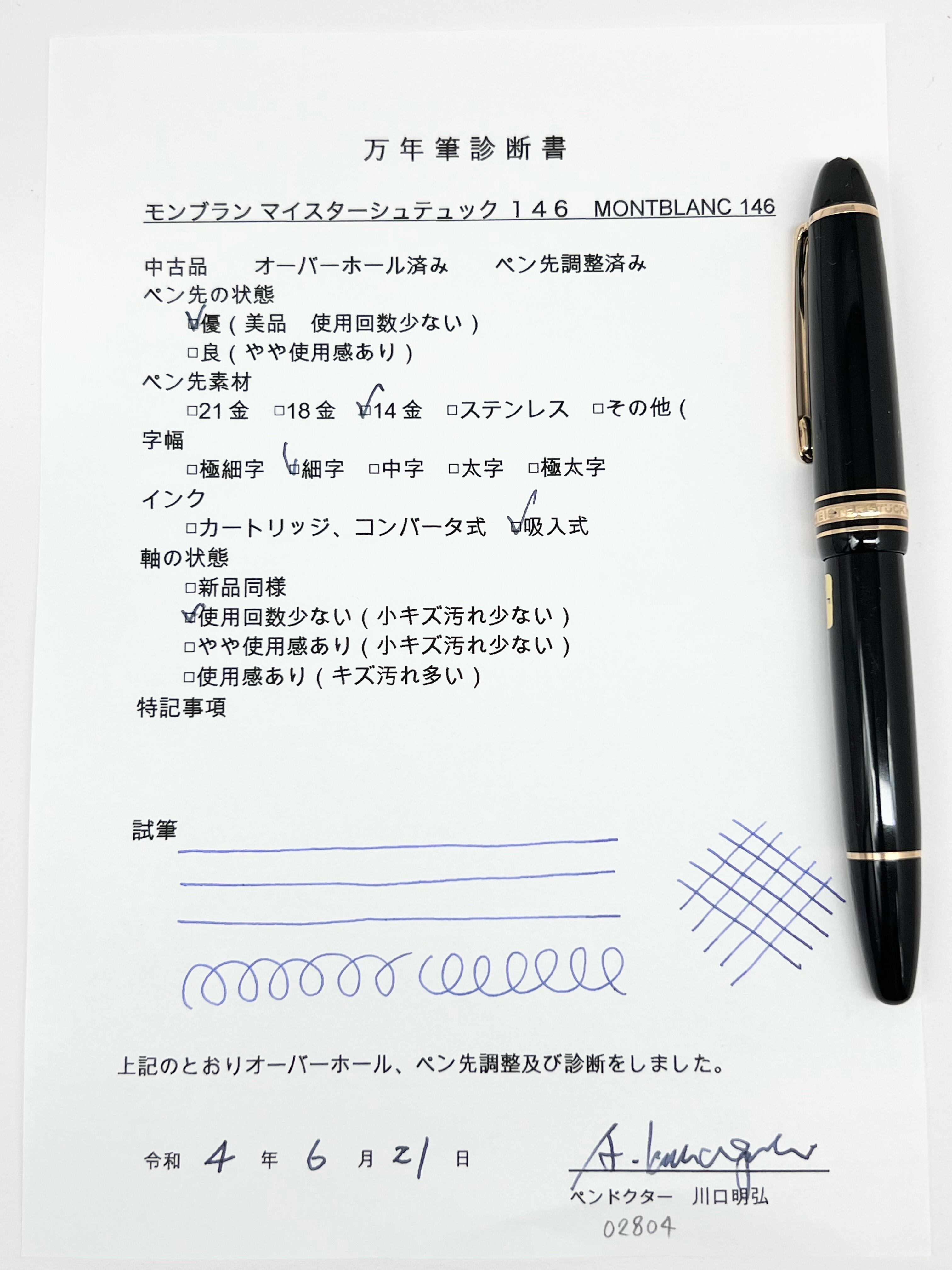 中古品 オーバーホール済み ペン先調整済み 字幅:ペン先表記「F」 細字 インク:吸入式 軸の使用感:使用回数少ない 付属品:万年筆診断書 ========== 1980年代製造 ペン先14金(ペン先表記「14K」) ペン芯エボナイト 段差あり 吸入良好