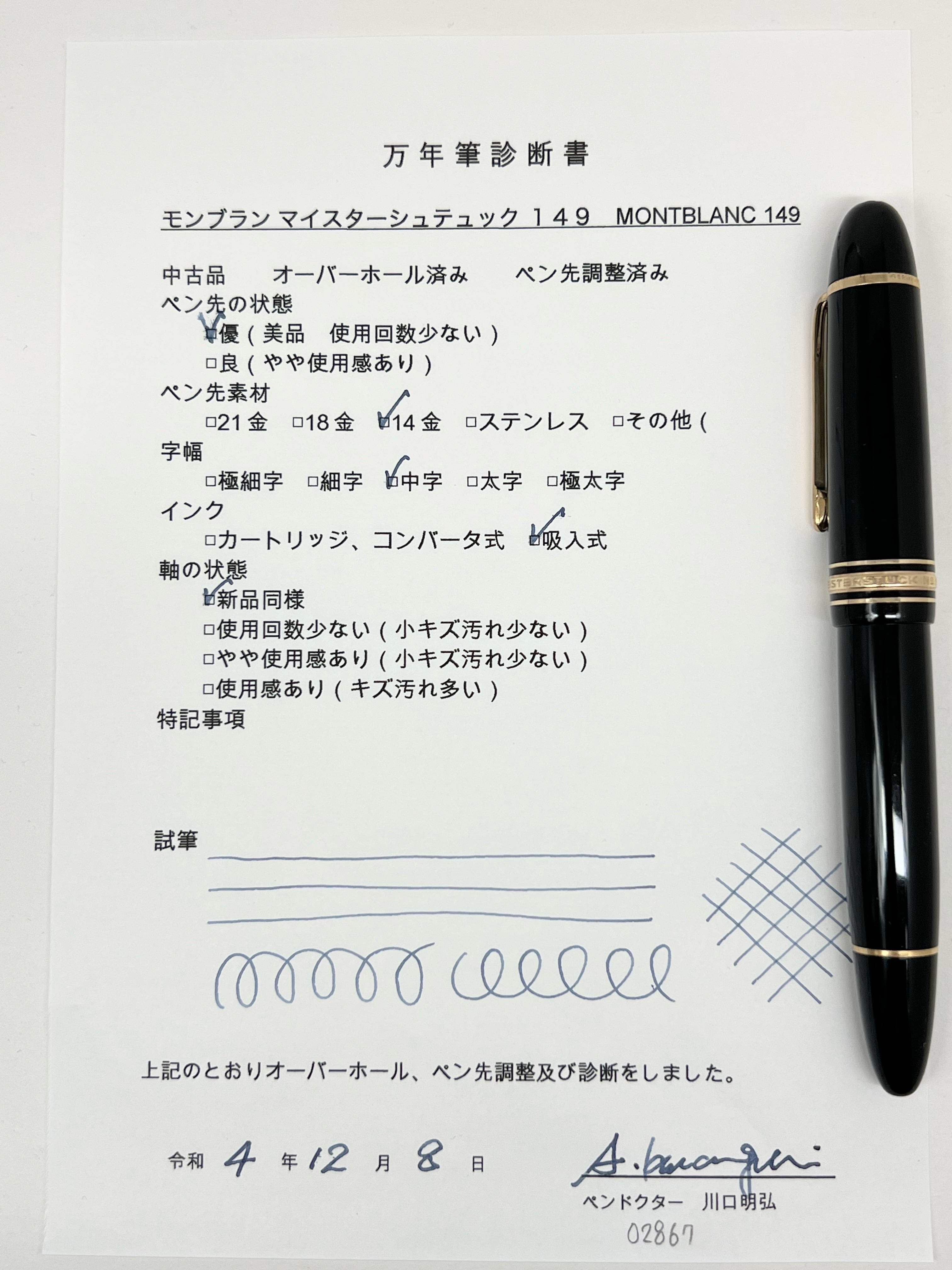 中古品 オーバーホール済み ペン先調整済み 字幅:中字 *細めの中字です。 インク:吸入式 軸の使用感:新品同様 付属品:万年筆診断書 ========== 1970年代製造 ペン先14金(ペン先表記「14C」) ペン芯エボナイト 溝、段差なし 吸入良好