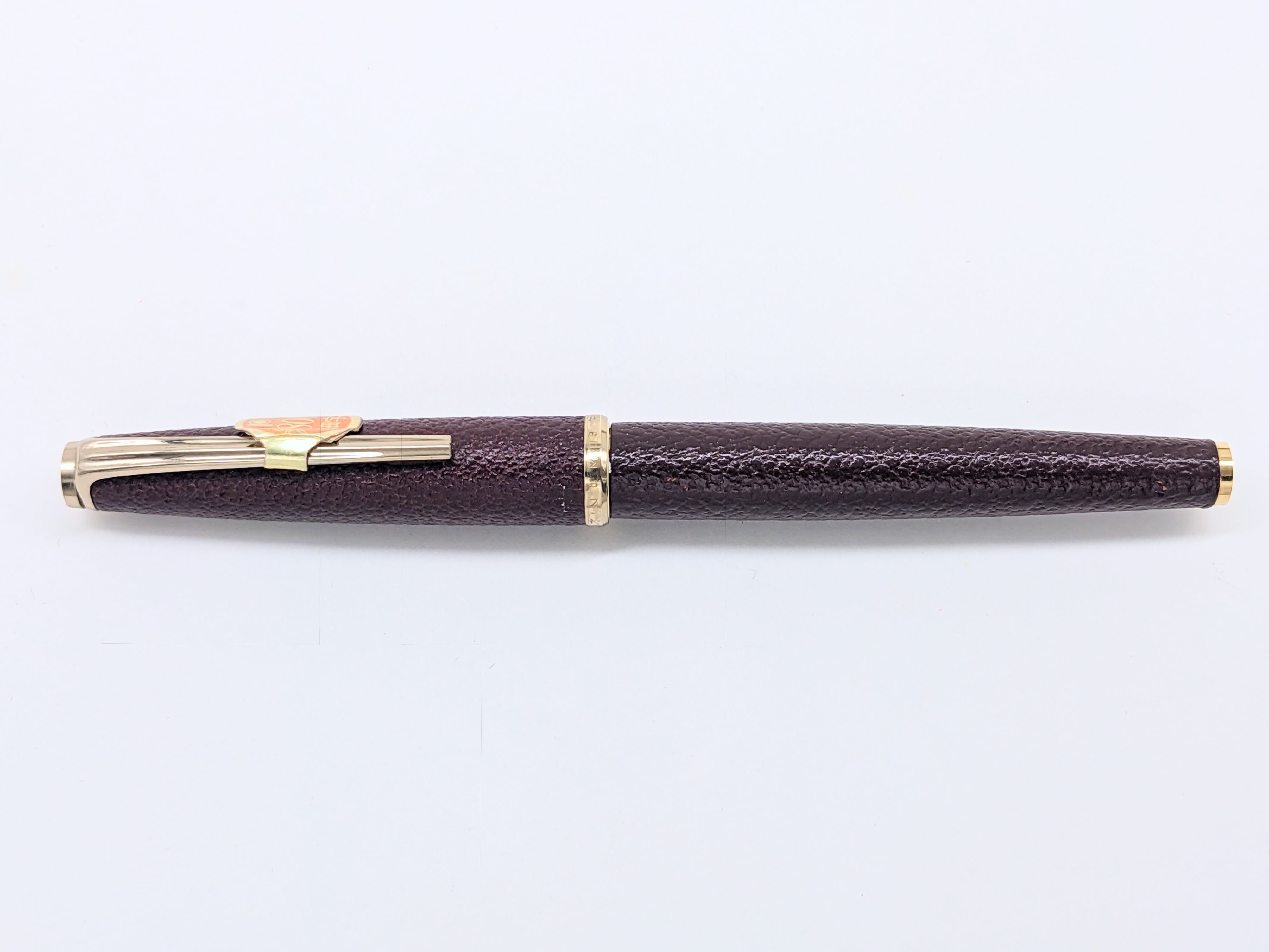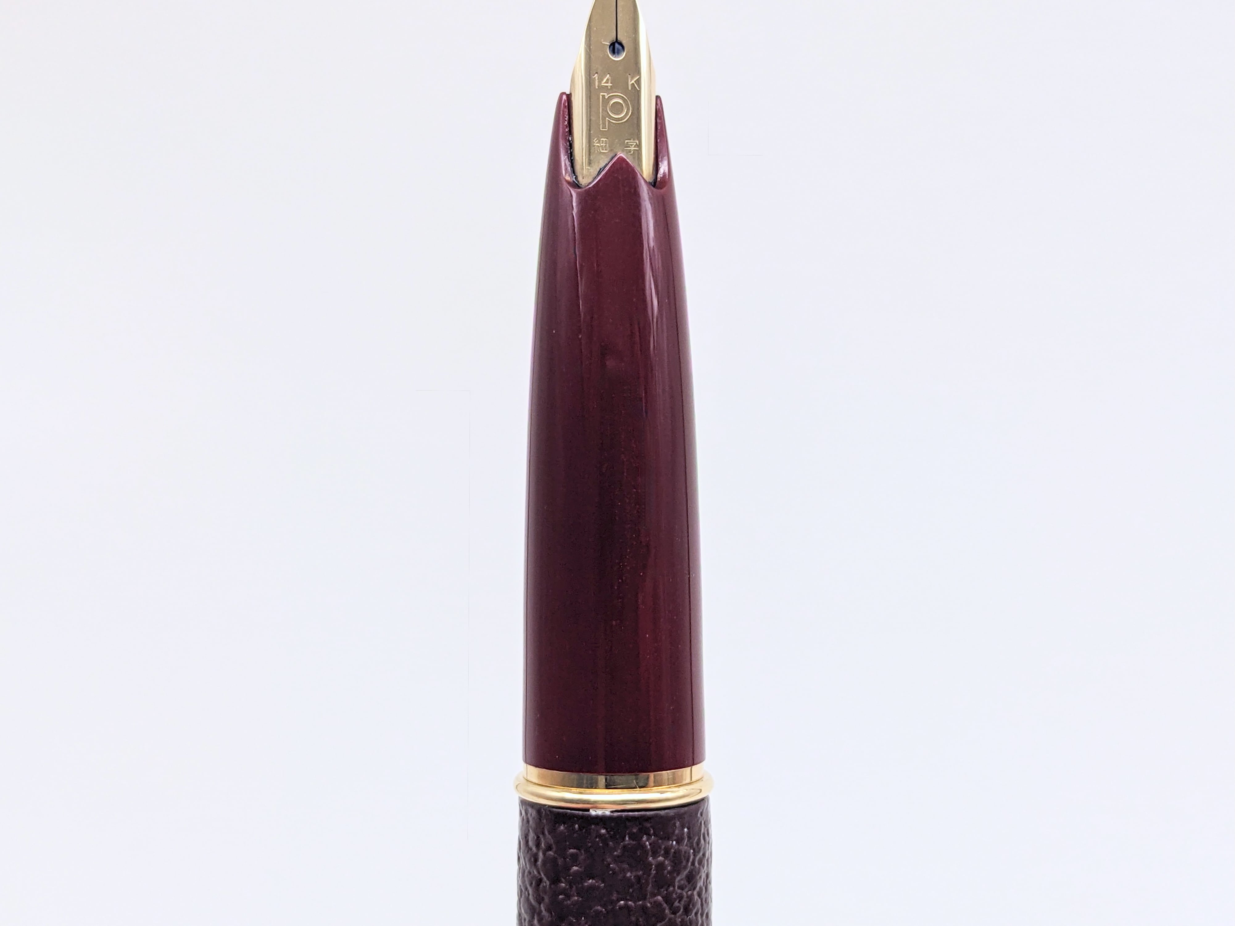 中古品 オーバーホール済み ペン先調整済み 字幅:ペン先表記「細字」 インク:カートリッジ式 コンバータ式 軸の使用感:使用回数少ない 付属品:カートリッジ1本(ブルーブラック) 万年筆診断書 ========== 1970年代製造 生産終了品 ペン先14金(ペン先表記「14K」) 軸:本革巻き(羊革) 当時定価:8,000円