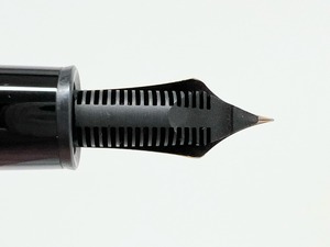 中古品 オーバーホール済み ペン先調整済み 字幅:細字 インク:吸入式 軸の使用感:使用回数少ない 付属品:万年筆診断書 ========== 1980年代製造 ペン先18金(ペン先表記「18K」) ペン芯エボナイト 溝、段差あり 吸入良好